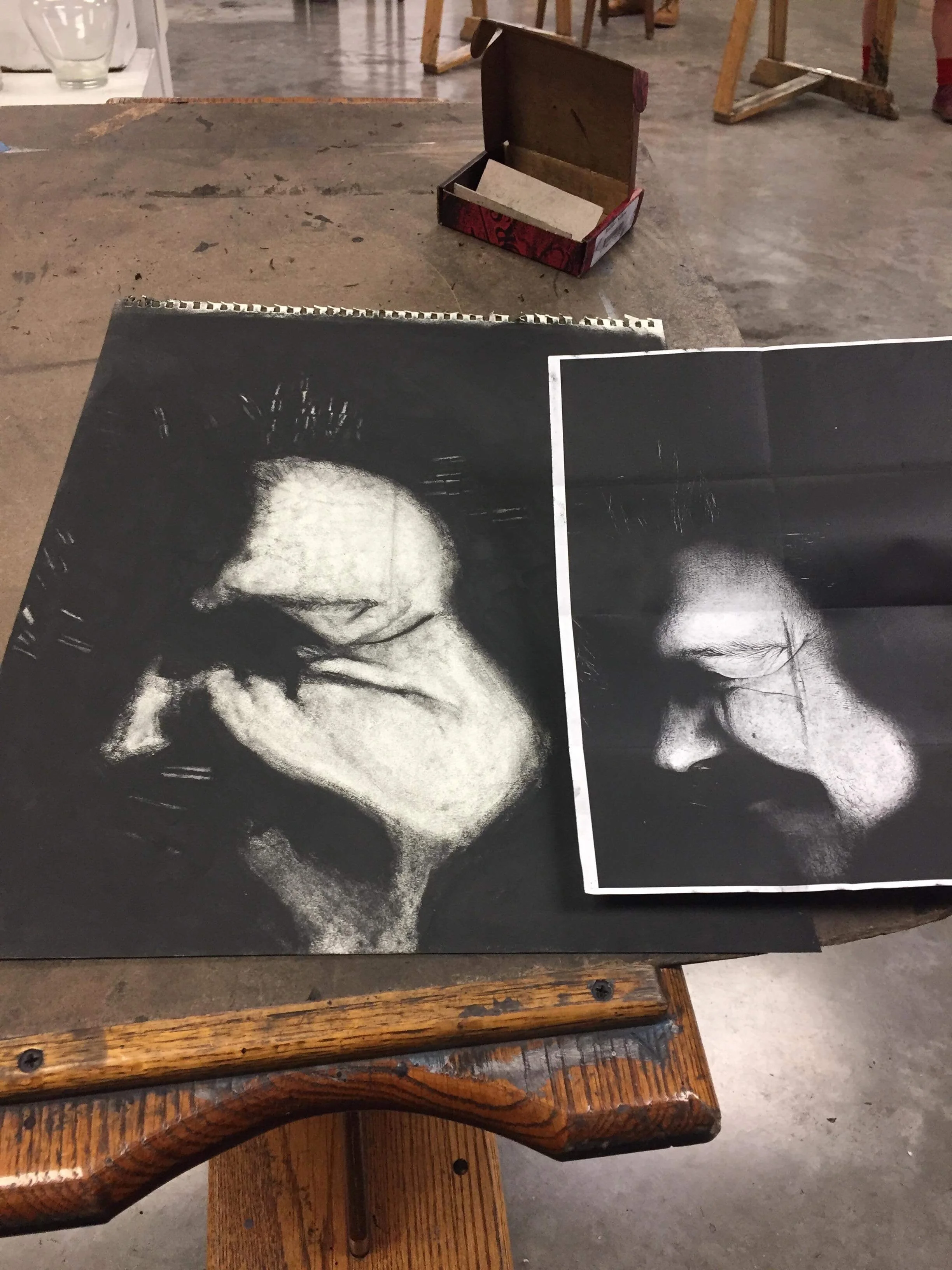 This project taught me a lot. Many artists won’t work if they don’t have the right mindset or whatnot. I was having a day where I just couldn’t imagine myself doing anything good. This happens a lot even to this day. “How could I ever make something so great?” Even though I’ve done many great art pieces? Well, I just got to work no matter how I felt. At the end everyone loved it. One of my favorite pieces now. Also, we started with a full page of charcoal. I had to make this by erasing. If you’ve never done art this way it really hurts your head. We had to press our face to the photocopier and then draw the printed photo. (The ladies like this one a lot for some reason. I’m convinced girls like horror artwork. Hmm… I’ll store that away for later.)