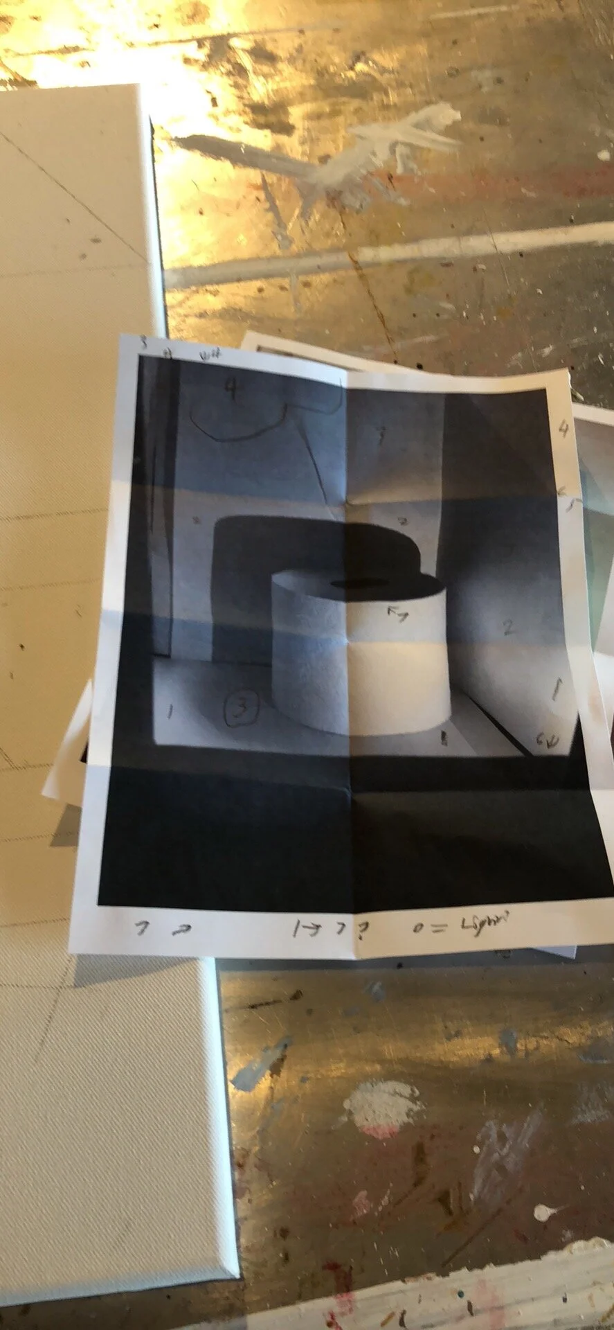 Learning how to make black, white and grey using complimentary colors. This entire painting is done with red and green. I used no blacks, whites or greys in this. Just different mixtures of red and green to create what you see here. Also included more pictures of my hands and the painting setup we had in the studio. That rack is where we kept our pallets so we didn’t have to take them home every day.
